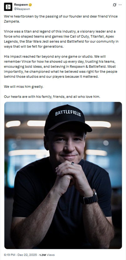 His impact reached far beyond any one game or studio. We will remember Vince for how he showed up every day, trusting his teams, encouraging bold ideas, and believing in Respawn & Battlefield. Most importantly, he championed what he believed was right for the people behind those studios and our players because it mattered.