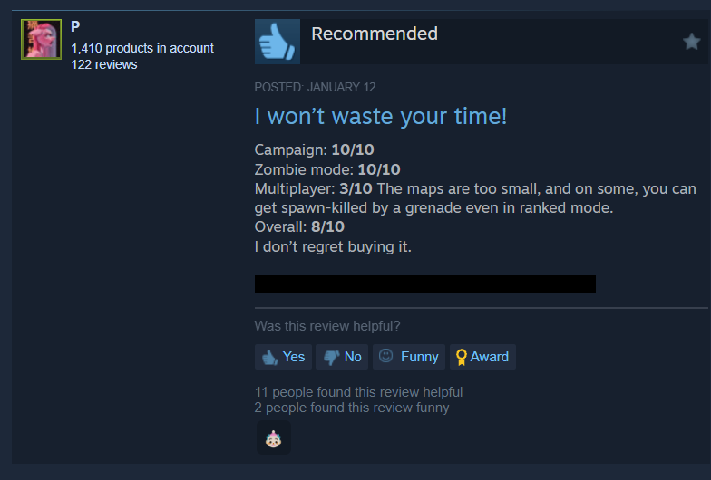 Another who recommended the game still bashed it for its lackluster multiplayer, “I won’t waste your time!