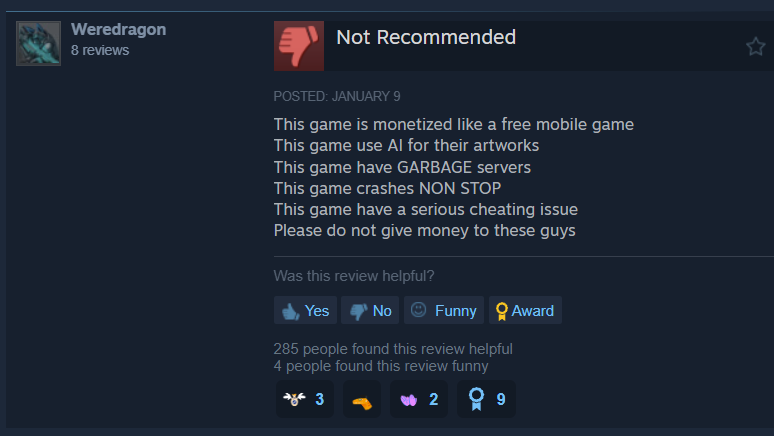 Weredragon wrote, “This game is monetized like a free mobile game. This game use AI for their artworks. This game have GARBAGE servers. This game crashes NON STOP. This game have a serious cheating issue. Please do not give money to these guys.”