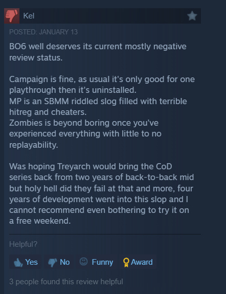 Kel lambasted the game, “BO6 well deserves its current mostly negative review status. Campaign is fine, as usual it's only good for one playthrough then it's uninstalled.