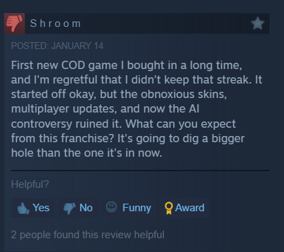 Another stated, “First new COD game I bought in a long time, and I'm regretful that I didn't keep that streak. It started off okay, but the obnoxious skins, multiplayer updates, and now the AI controversy ruined it. What can you expect from this franchise? It's going to dig a bigger hole than the one it's in now.”