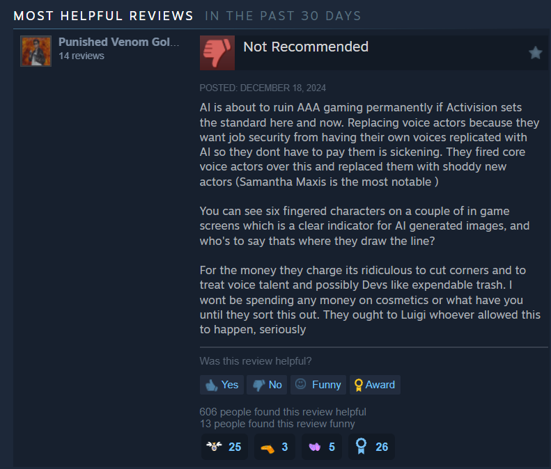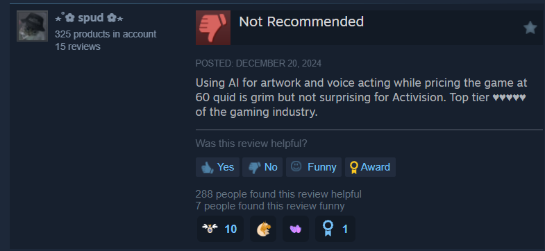 “Using AI for artwork and voice acting while pricing the game at 60 quid is grim but not surprising for Activision. Top tier ♥♥♥♥♥ of the gaming industry,” wrote spud.