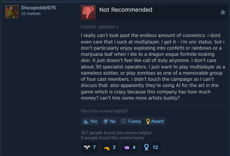 Another wrote, “I really can't look past the endless amount of cosmetics. i dont even care that I suck at multiplayer. I get it - i'm unc status. but i don't particularly enjoy exploding into confetti or rainbows or a marijuana leaf when I die to a dragon esque fortnite looking skin. it just doesn't feel like call of duty anymore. I don't care about 30 specialist operators. I just want to play multiplayer as a nameless soldier, or play zombies as one of a memorable group of four cast members. i didn't touch the campaign so I can't discuss that. also apparently they're using AI for the art in the game which is crazy because this company has how much money? can't hire some more artists buddy?”