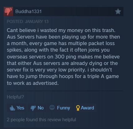“Cant believe i wasted my money on this trash,” wrote Buddha1331. “Aus Servers have been playing up for more then a month, every game has multiple packet loss spikes, along with the fact it often joins you overseas servers on 300 ping makes me believe that either Aus servers are already dying or the server fix is very very low priority. i shouldn't have to jump through hoops for a triple A game to work as advertised.”