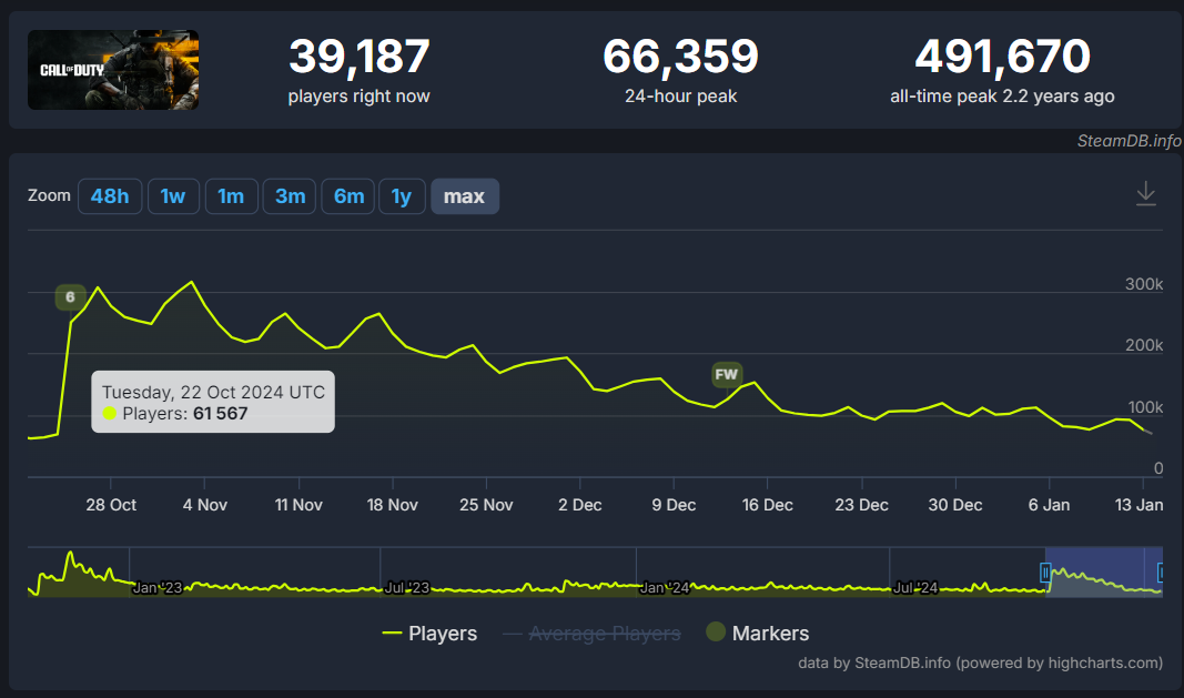 The last time it was that low was just before Black Ops 6 released when it hit a peak concurrent of 68,421 on October 24, 2024.