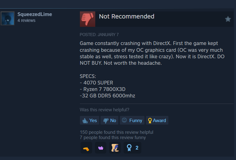 SqueezedLime wrote, “Game constantly crashing with DirectX. First the game kept crashing because of my OC graphics card (OC was very much stable as well, stress tested it like crazy). Now it is DirectX. DO NOT BUY. Not worth the headache.”