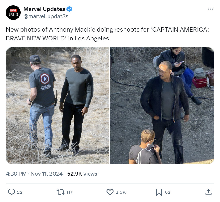 It wrote, “New photos of Anthony Mackie doing reshoots for ‘CAPTAIN AMERICA: BRAVE NEW WORLD’ in Los Angeles.”