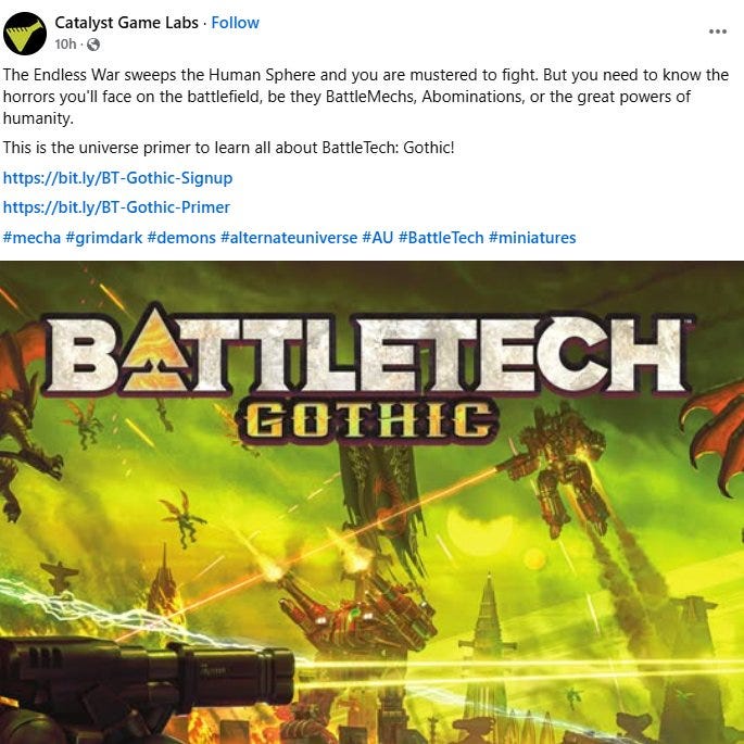 Catalyst Game Labs posted to Facebook about the product, saying, “The Endless War sweeps the Human Sphere, and you are mustered to fight. But you need to know the horrors you’ll face on the battlefield, be they BattleMechs, Abominations, or the great powers of humanity. This is the universe primer to learn all about BattleTech: Gothic.”
