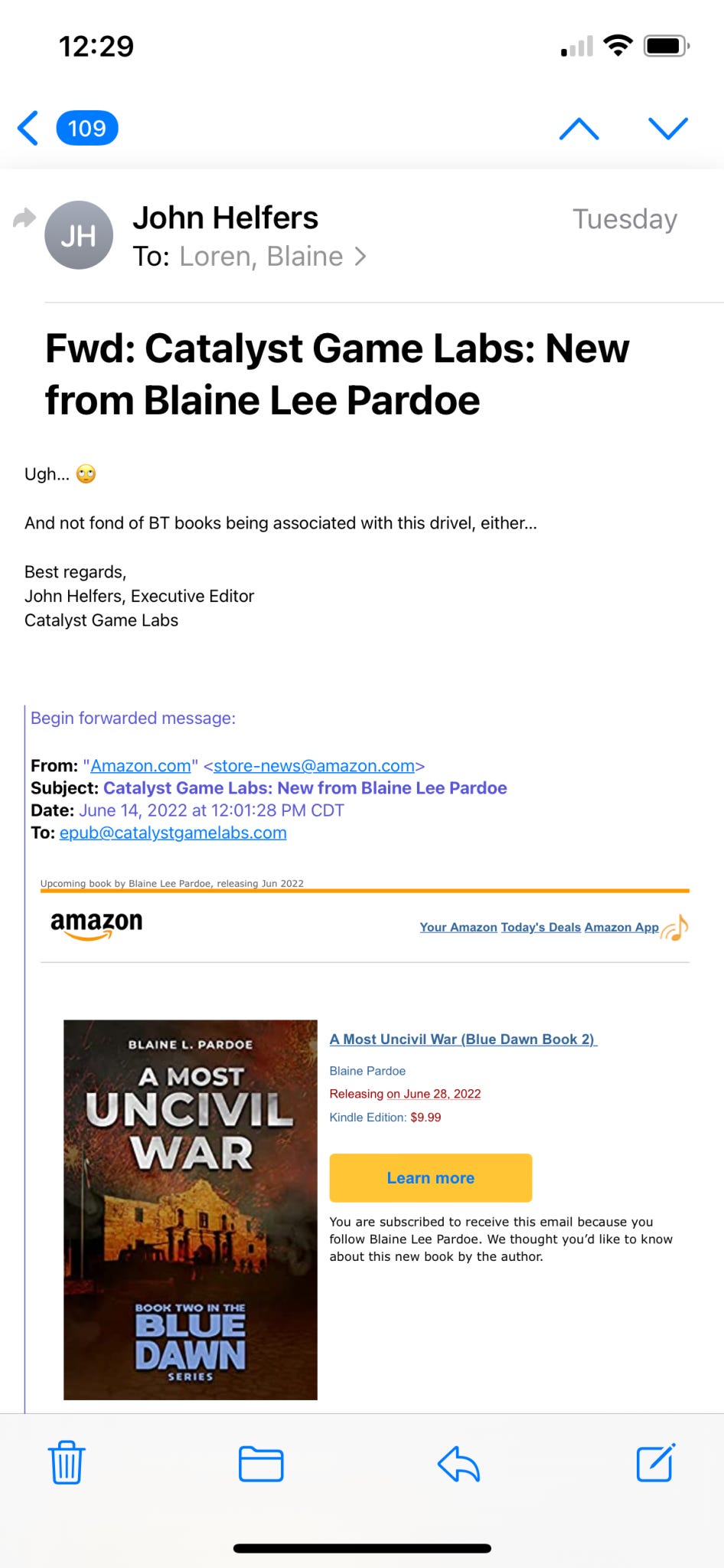Blaine Pardoe suspects it’s the work of executive editor John Helfers, who has previously commented on Pardoe saying, “And not fond of BT Books being associated with this drivel,” when speaking to Pardoe’s work.