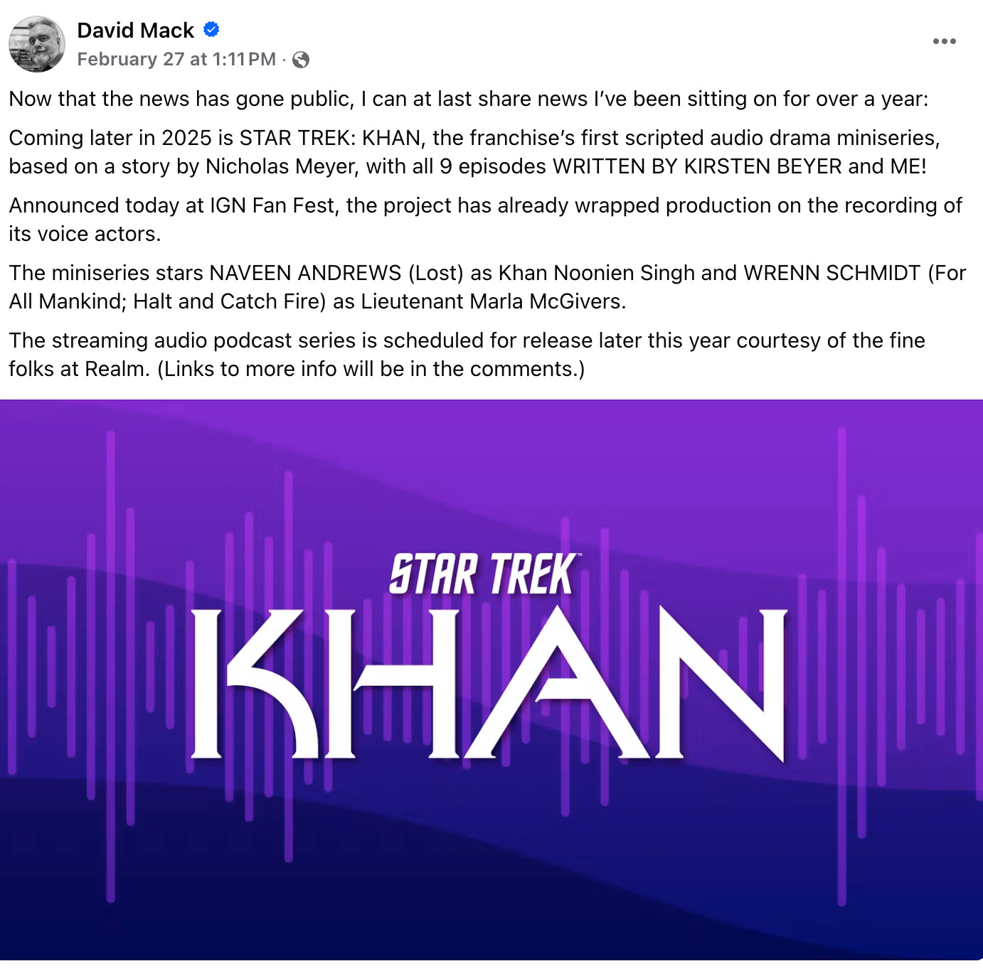 Coming later in 2025 is STAR TREK: KHAN, the franchise’s first scripted audio drama miniseries, based on a story by Nicholas Meyer, with all 9 episodes WRITTEN BY KIRSTEN BEYER and ME! Announced today at IGN Fan Fest, the project has already wrapped production on the recording of its voice actors. The miniseries stars NAVEEN ANDREWS (Lost) as Khan Noonien Singh and WRENN SCHMIDT (For All Mankind; Halt and Catch Fire) as Lieutenant Marla McGivers. The streaming audio podcast series is scheduled for release later this year courtesy of the fine folks at Realm. (Links to more info will be in the comments.)”