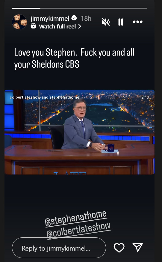 Jimmy Kimmel posted a reel to his Instagram Stories writing, “Love you Stephen. F**k you and all your Sheldons CBS.”