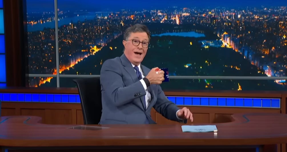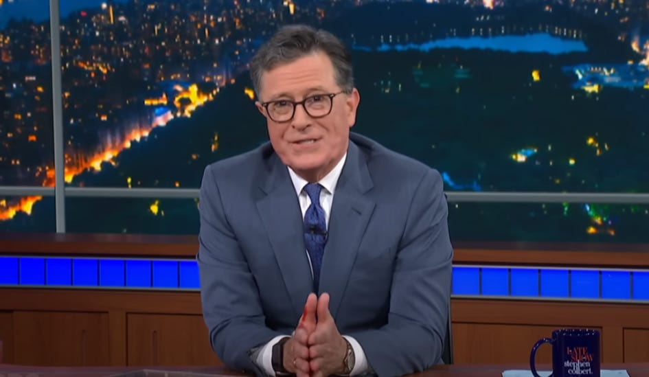 All these late night “comedians” are a waste of cyber space. They are not there on merit, but because they push the right messaging. Colbert may be the worst one.