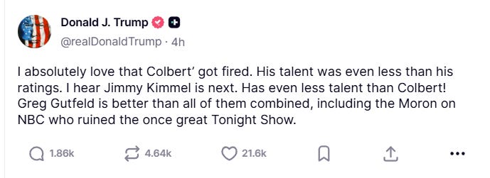 President Donald Trump reacted to the show getting canceled writing on Truth Social, “I absolutely love that Colbert’ got fired. His talent was even less than his ratings. I hear Jimmy Kimmel is next. Has even less talent than Colbert! Greg Gutfeld is better than all of them combined, including the Moron on NBC who ruined the once great Tonight Show.”