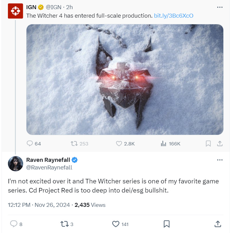 X user Raven Raynefall shared her concern that The Witcher 4 will be infected with the DEI agenda in reaction to an IGN post declaring that “The Witcher 4 has entered full-scale production.”