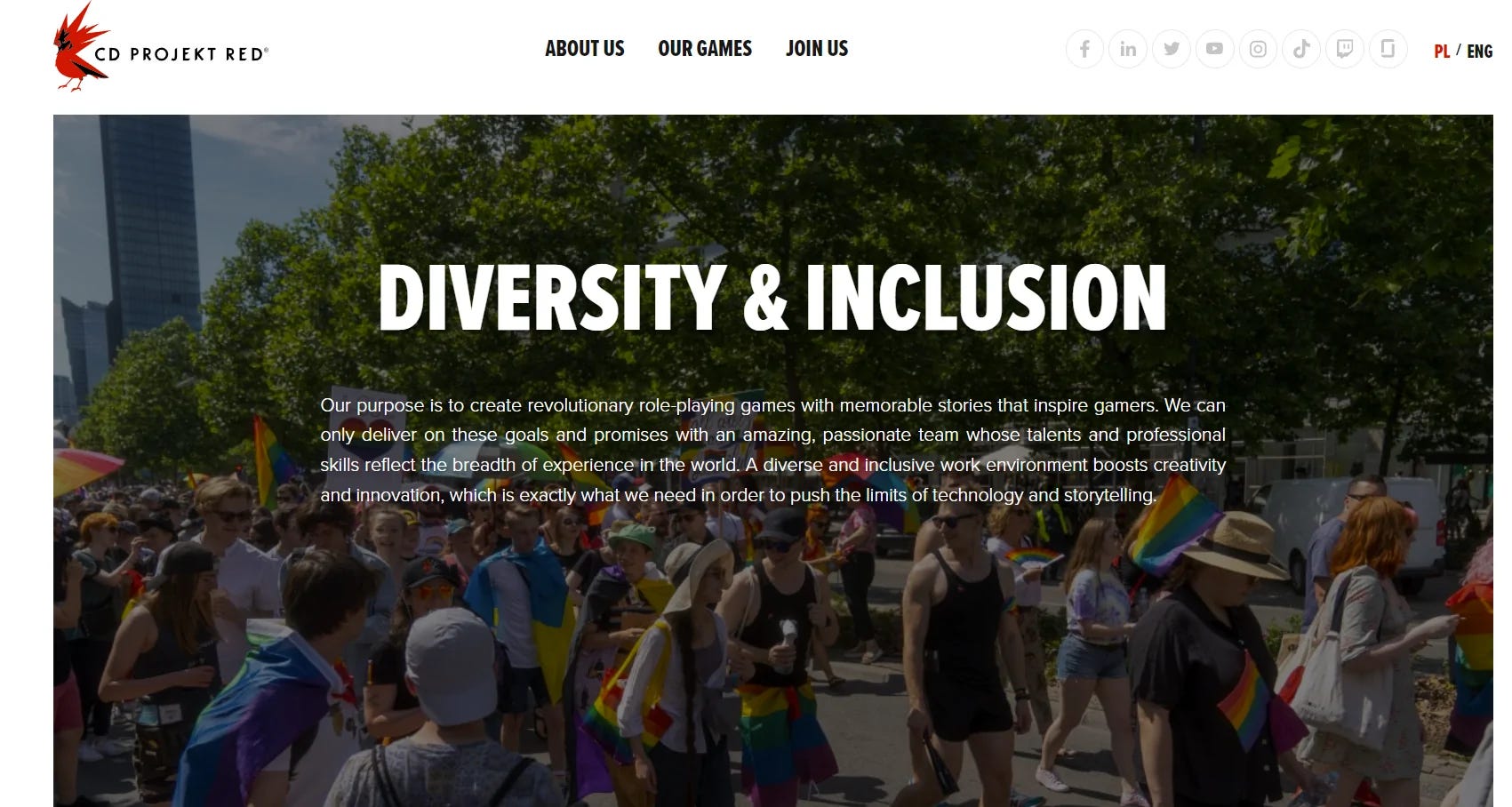 In fact, one of the initiatives is The Diversity Charter. CD Projekt Red explains, “We’re among the companies that signed the Diversity Charter (Karta Różnorodności), a document committing to non-discrimination in the workplace as well as to the introduction of policies that create and promote diversity. We were also listed as one of the top employers in Poland in terms of managing diversity and inclusion.”
