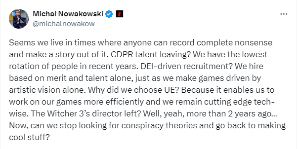 In response to this Nowakowski posted on X, “Seems we live in times where anyone can record complete nonsense and make a story out of it. CDPR talent leaving? We have the lowest rotation of people in recent years.”