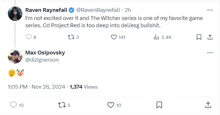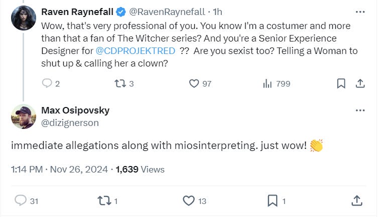 Raynefall reacted writing, “Wow, that's very professional of you. You know I'm a costumer and more than that a fan of The Witcher series? And you're a Senior Experience Designer for CD Projekt Red ?? Are you sexist too? Telling a woman to shut up & calling her a clown?”