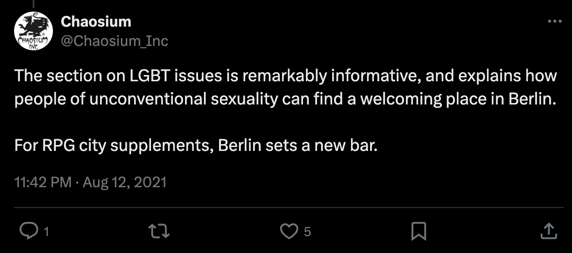 The company’s X account went deep into the thread before they revealed the wokeness inside, “The section on LGBT issues is remarkably informative, and explains how people of unconventional sexuality can find a welcoming place in Berlin. For RPG city supplements, Berlin sets a new bar.”