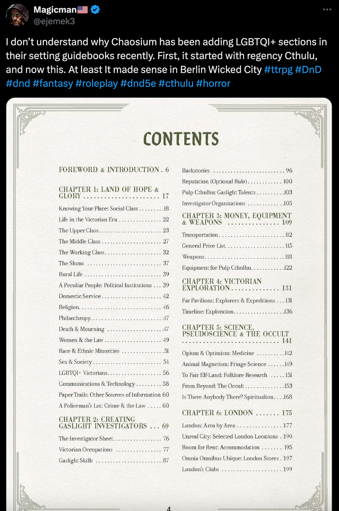 X user Magicman first pointed out the new Cthulhu by Gaslight book has a full LGBTQI+ section listed in its table of contents. He posted the table saying, “I don’t understand why Chaosium has been adding LGBTQI+ sections in their setting guidebooks recently. First, it started with regency Cthulu, and now this. At least It made sense in Berlin Wicked City #ttrpg #DnD #dnd #fantasy #roleplay #dnd5e #cthulu #horror”