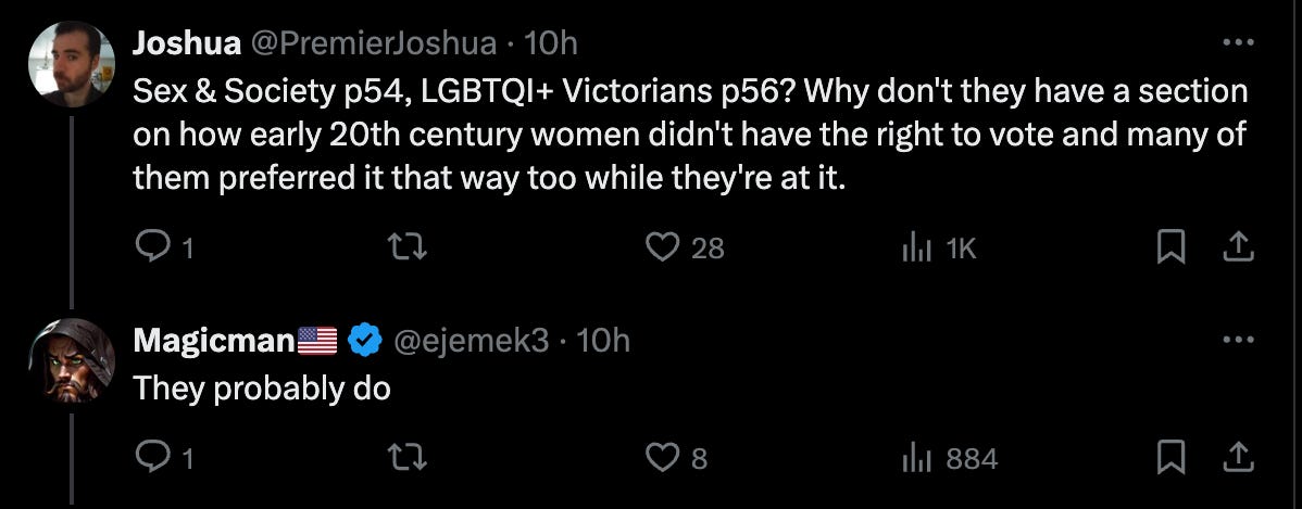 It was followed by several commenters talking about how ridiculous it is to have such a section in a Victorian-era setting. One user quipped in the comments, “Sex & Society p54, LGBTQI+ Victorians p56? Why don't they have a section on how early 20th century women didn't have the right to vote and many of them preferred it that way too while they're at it.”