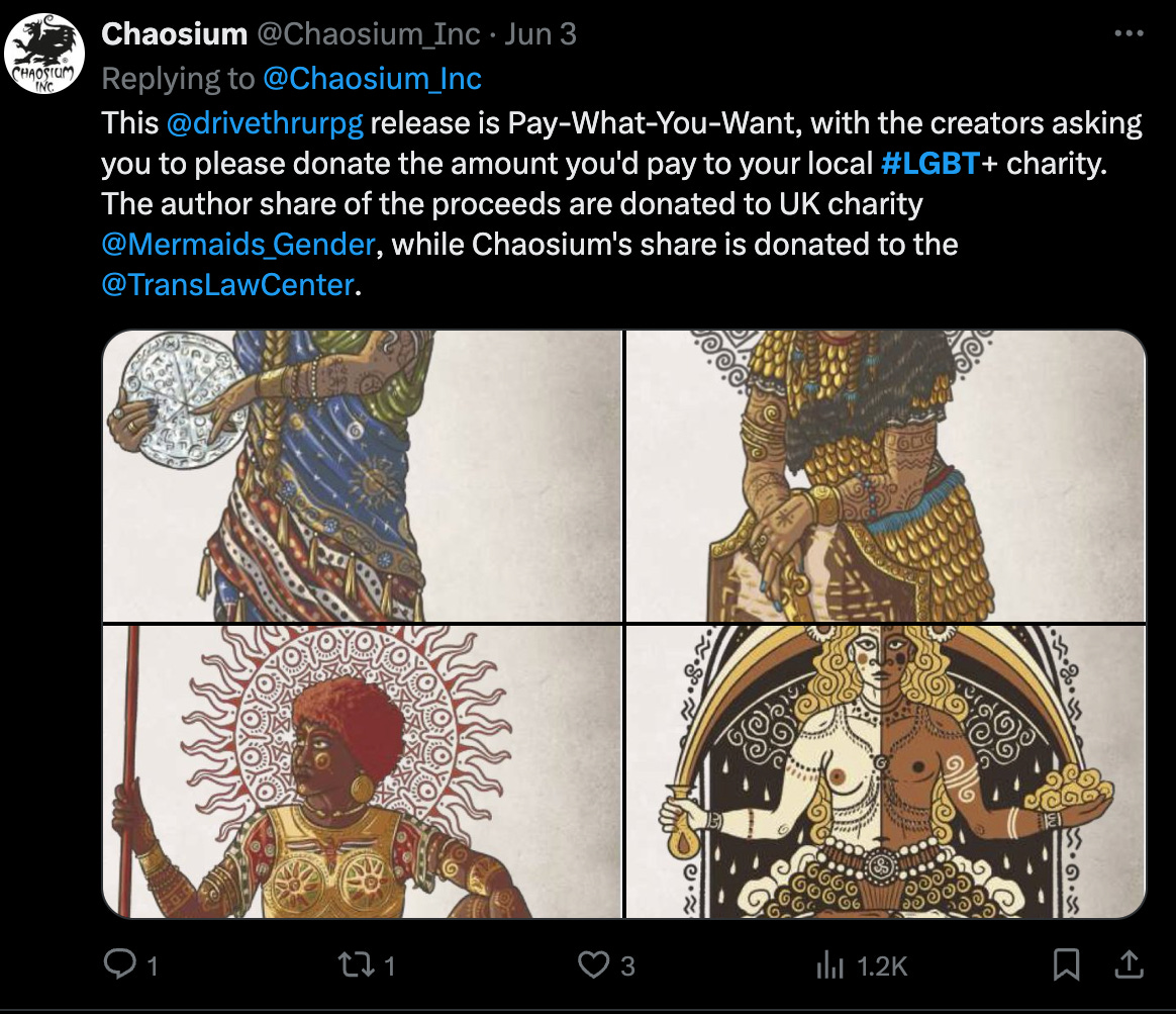 @drivethrurpgrelease is Pay-What-You-Want, with the creators asking you to please donate the amount you'd pay to your local #LGBT+ charity. The author share of the proceeds are donated to UK charity @Mermaids_Gender, while Chaosium's share is donated to the @TransLawCenter.”