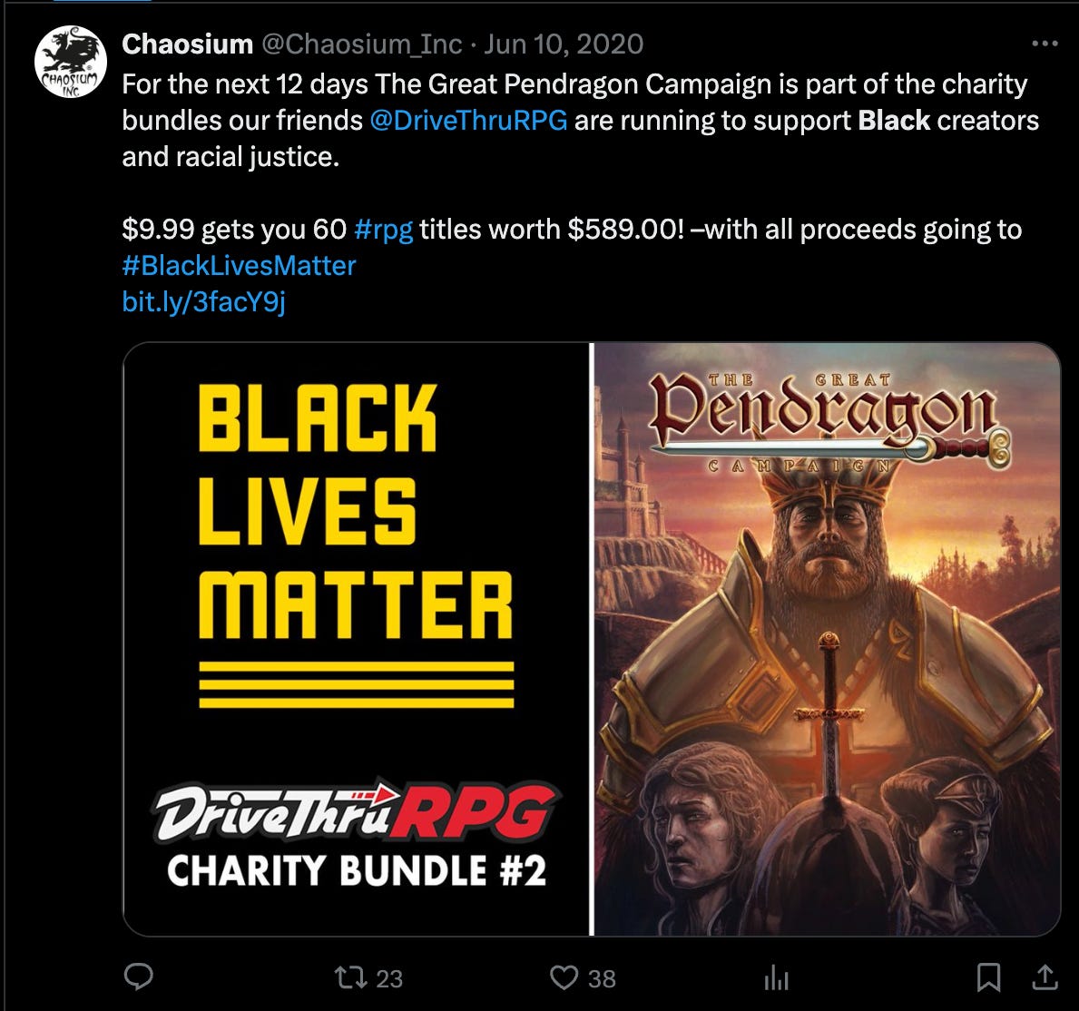 Chaosium also waded into racial controversy by using their Pendragon line to promote the grifting organization #BlackLivesMatter in 2020, “For the next 12 days The Great Pendragon Campaign is part of the charity bundles our friends @DriveThruRPGare running to support Black creators and racial justice. $9.99 gets you 60 #rpg titles worth $589.00! –with all proceeds going to #BlackLivesMatter”