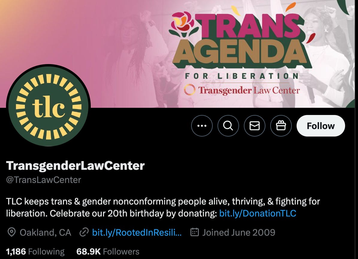 The Trans Law Center X account profile out of Oakland, CA describes the organization as “keeps trans & gender nonconforming people alive.”
