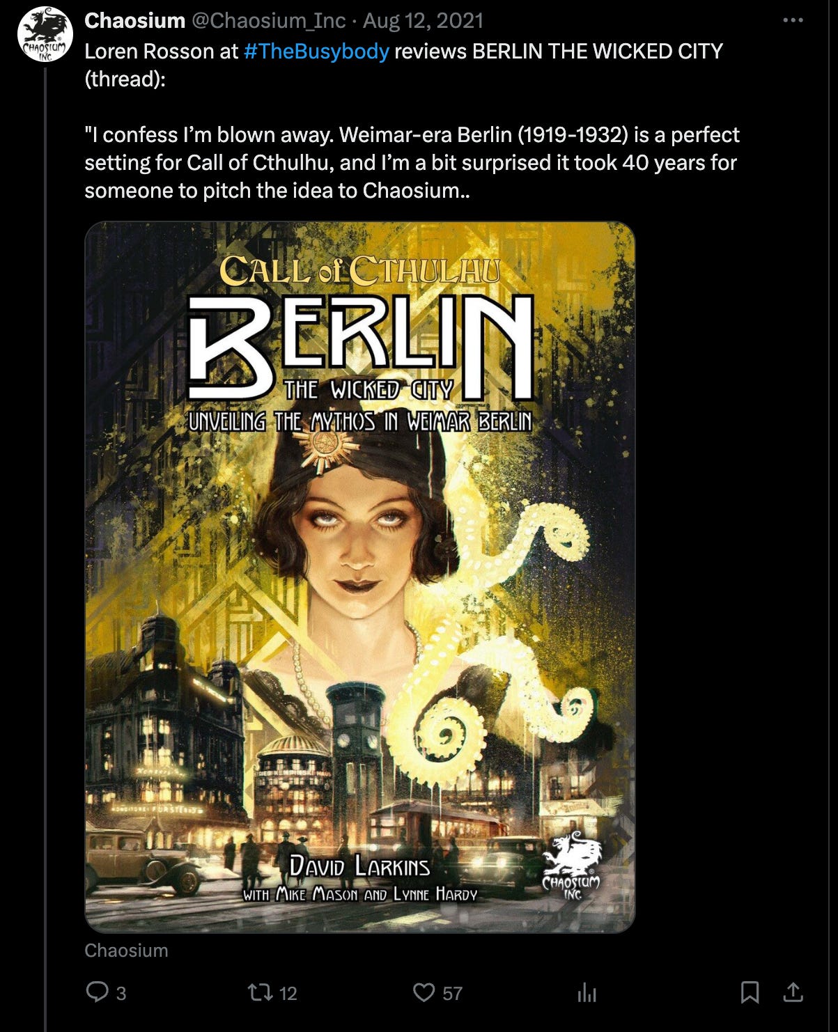In a thread about their 2021 release, Berlin The Wicked City in the same game system, the company started a thread about the product, “Loren Rosson at #TheBusybody reviews BERLIN THE WICKED CITY (thread): "I confess I’m blown away. Weimar-era Berlin (1919-1932) is a perfect setting for Call of Cthulhu, and I’m a bit surprised it took 40 years for someone to pitch the idea to Chaosium.”
