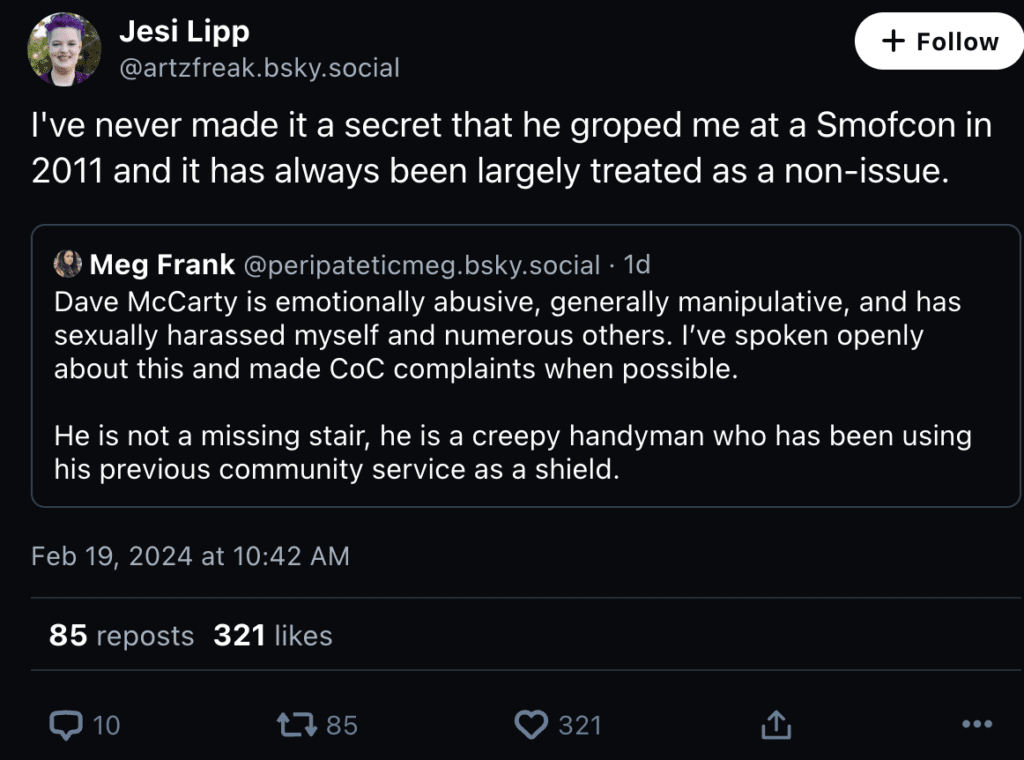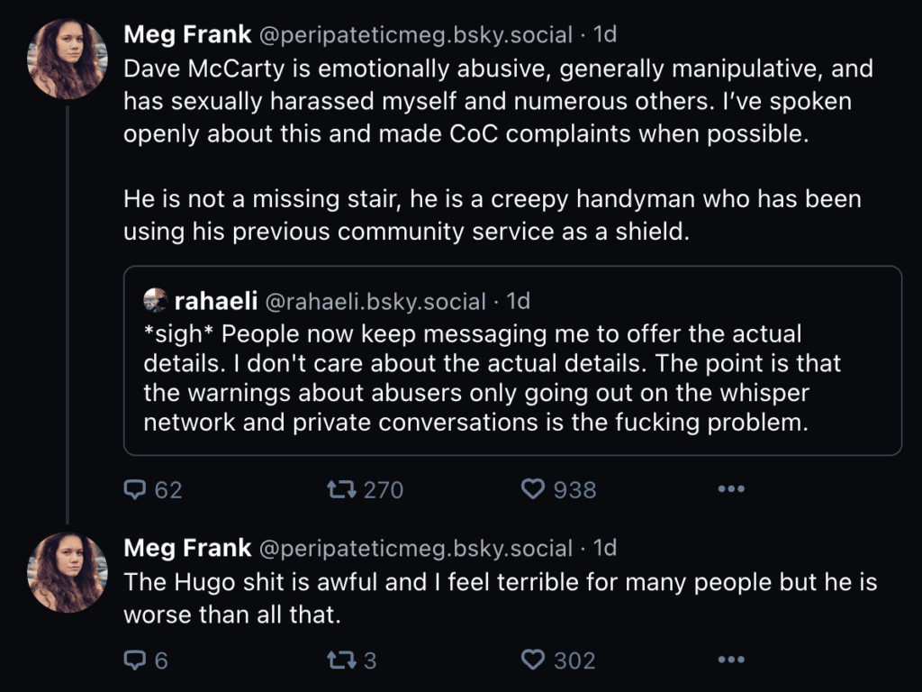 Posting to the left-wing echo chamber BlueSky, artist Meg Frank said, “Dave McCarty is emotionally abusive, generally manipulative, and has sexually harassed myself and numerous others. I’ve spoken openly about this and made CoC complaints when possible. He is not a missing stair, he is a creepy handyman who has been using his previous community service as a shield. The hugo shit is awful, and I feel terrible for many people but he is worse than all that.”