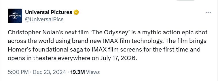 When the film was first announced Universal described the film as a “mythic action epic shot across the world using brand new IMAX film technology. The film brings Homer’s foundational saga to IMAX film screens for the first time and opens in theaters everywhere on July 17, 2026.”