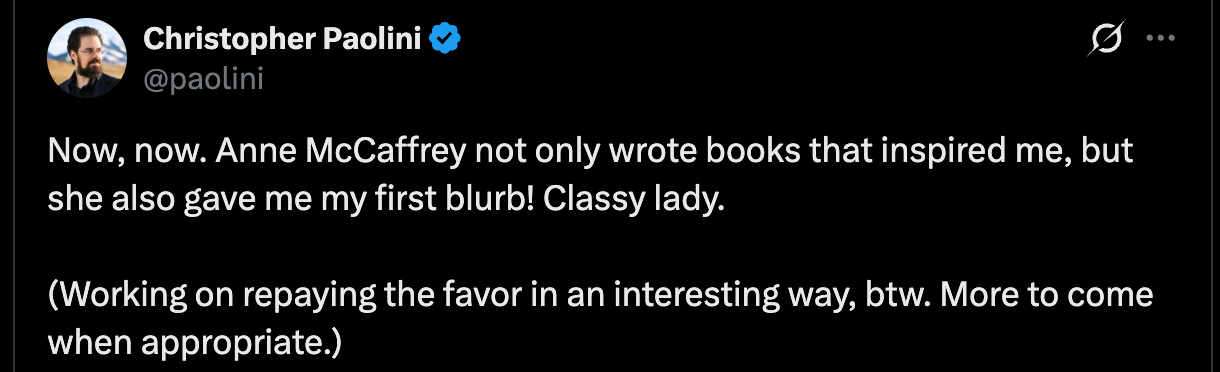 Paolini, tagged, came to McCaffrey’s defense over the meme, however, saying, “Now, now. Anne McCaffrey not only wrote books that inspired me, but she also gave me my first blurb! Classy lady. (Working on repaying the favor in an interesting way, btw. More to come when appropriate.)”