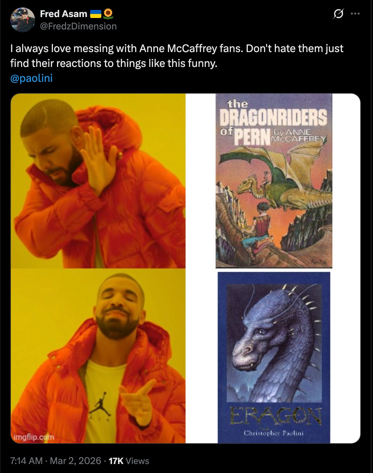 One fan thought it’d be fun to post a meme (which seemed to be good-natured) regarding turning away from Anne McCaffrey’s masterpiece of The Dragonriders of Pern, while encouraging Paolini’s Inheritance Cycle. He followed it with commentary that he “loves messing with Anne McCaffrey fans.”