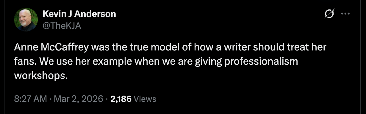 He wasn’t the only one to shout out McCaffrey for being a classy lady. Kevin J. Anderson, famous for his Star Wars extended universe novels, joined in with some praise of his own.