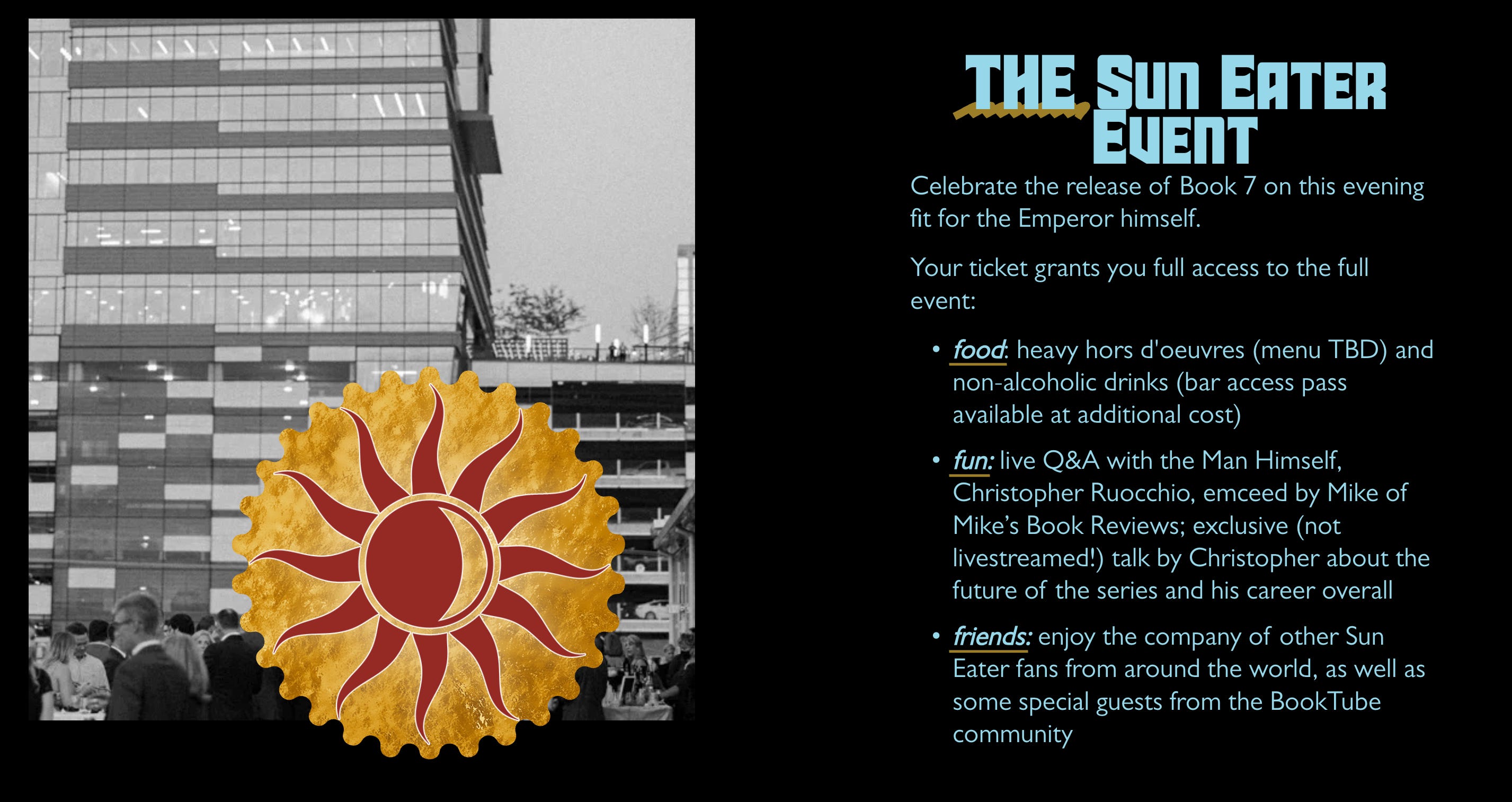The event is being held in Raleigh, NC, and includes food and a Q&A with Christopher Ruocchio. There are different tiers for table seating, general seating, and standing room at the bar for fans, including a $325 VIP package that includes a pre-gala meet and greet and additional signings, something that one might generally see for a rockstar.