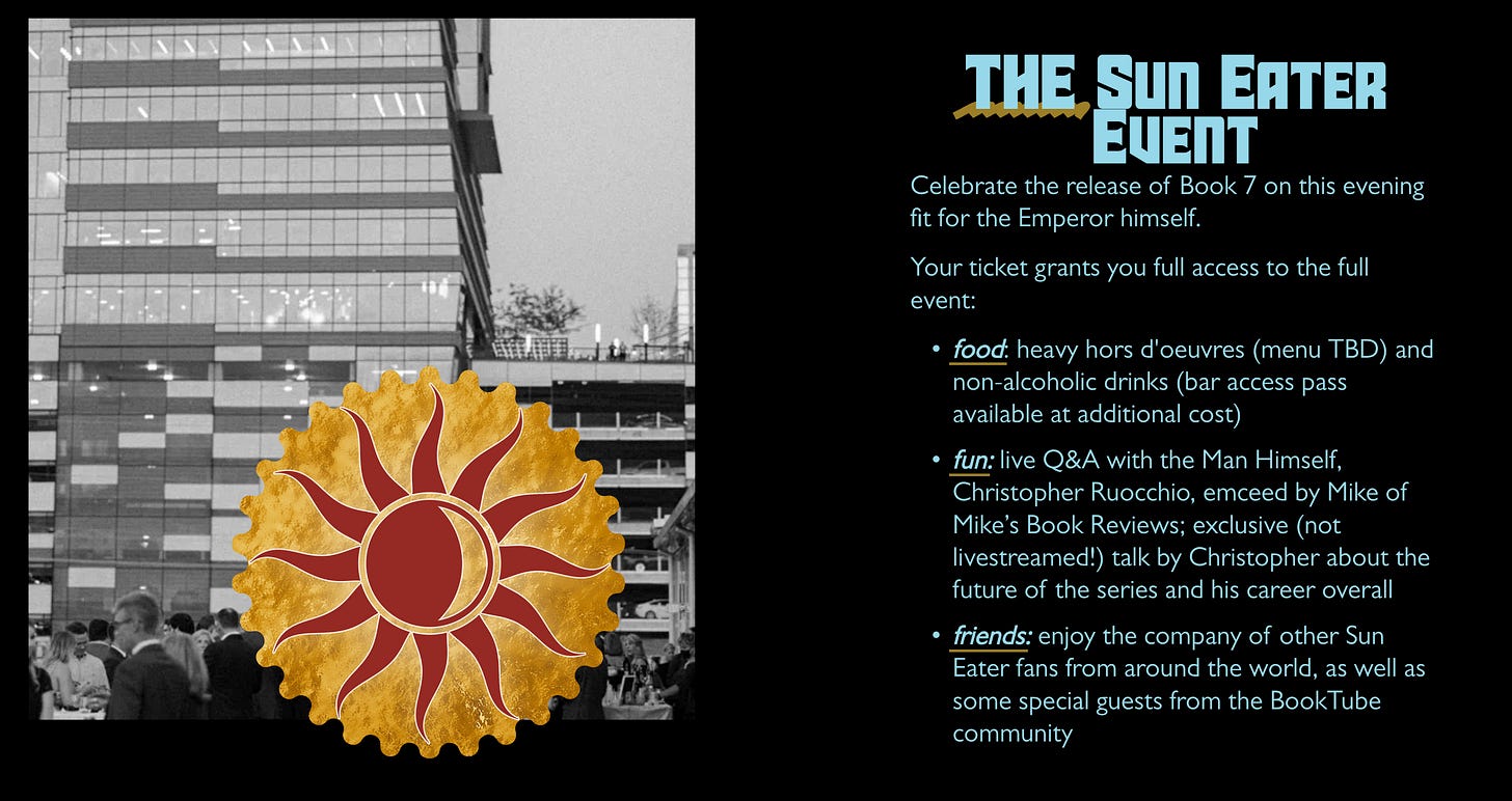 Mike of Mike's Book Reviews will be joining us as Master of Ceremonies, and we're expecting some other Booktube guests as well! Join us to celebrate the end of the Sun Eater, to get your books signed, and to hear a little bit about the future--with maybe a short look at the next series.