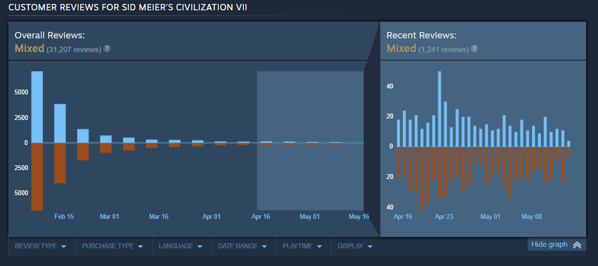 Another reviewed, “I'm another ‘since Civ 1’ player. Have owned and played every version. Civ 7 is an admirable try to evolve the game but it's the least enjoyable version I've played yet. The different ‘Eras’ and complete break and short era length and complete focus on the same goals every time make every game feel the same and redundant. The map size limit of Standard is horrible too. It feels like a fancy mobile version. Please fix it.”