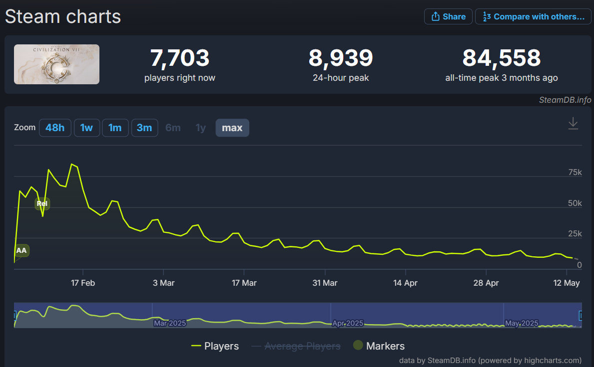 Peak player counts for Civilization VII on Steam are down nearly 90% since the game released in the middle of February.