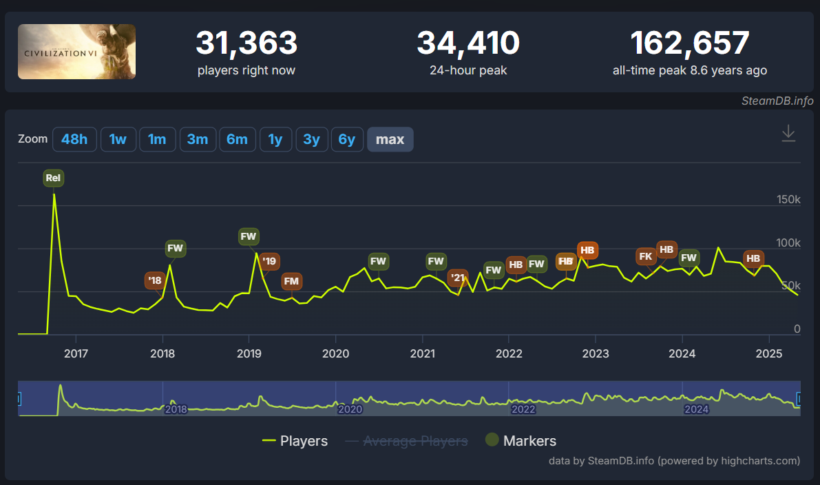To put that in perspective, Civilization VI had a 24-hour peak player count of 34,410. That is 284.9% more than Civilization VII. Civilization VI released in 2016 nearly a decade ago.