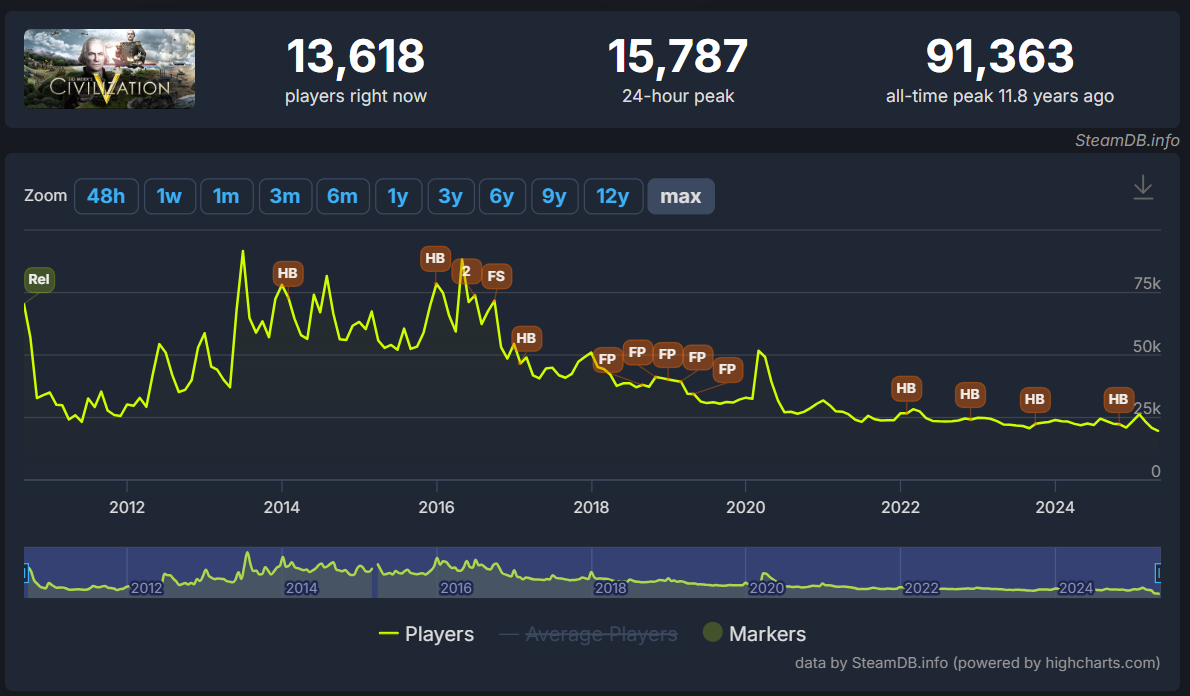Civilization V had a 24-hour peak player count of 15,787. That’s 76% more than Civilization VII. Civilization V released in 2010.