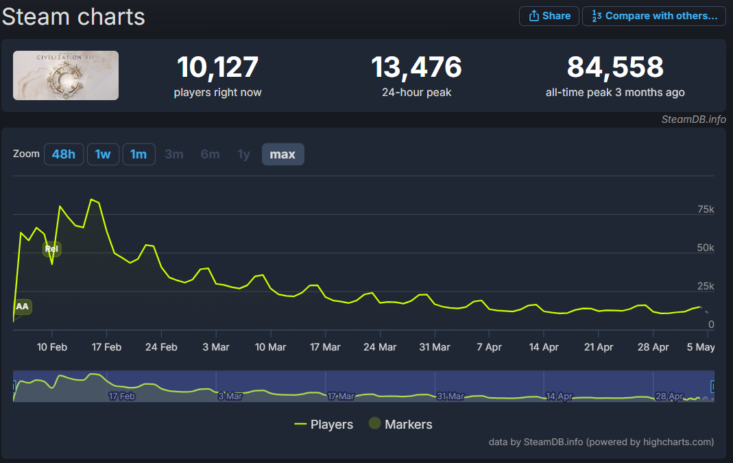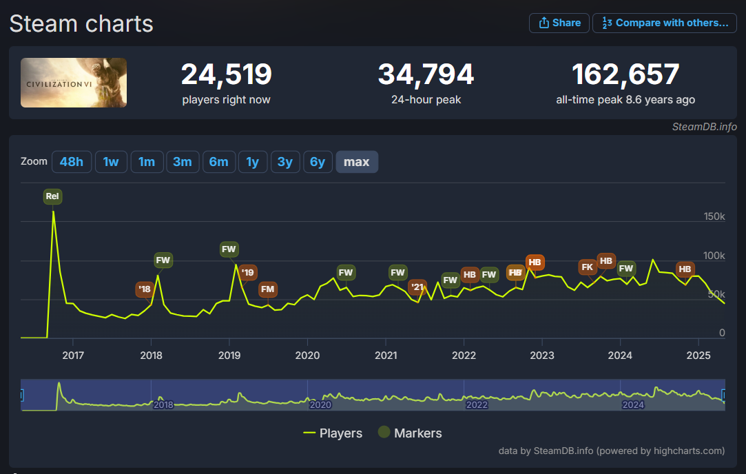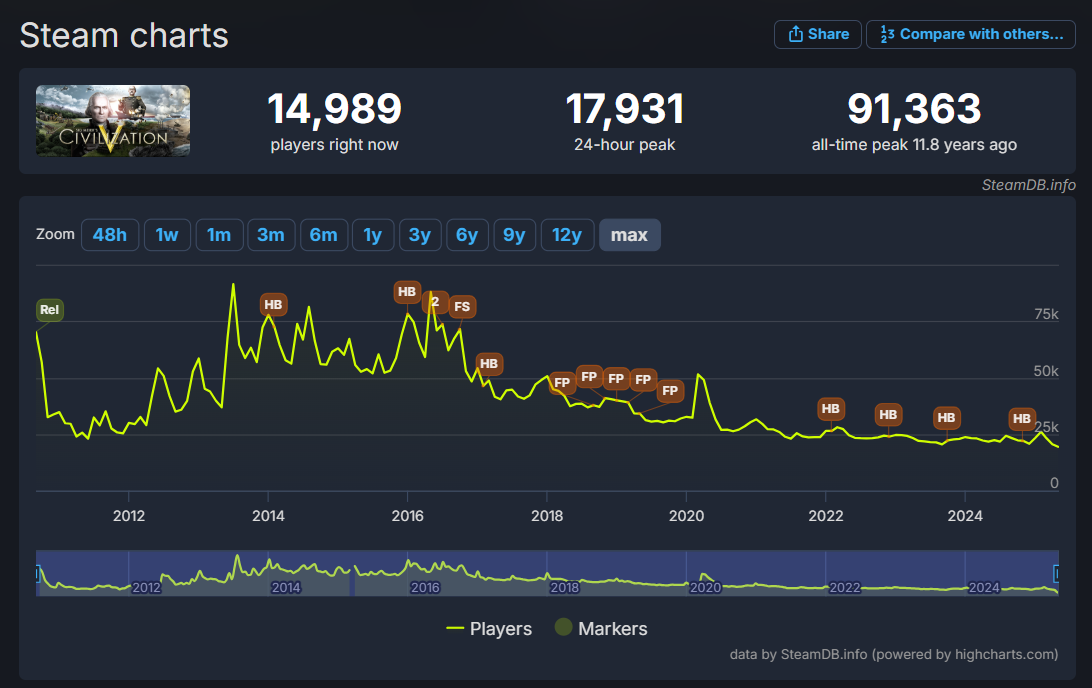 Similarly Civilization V also has a higher 24-hour peak than Civilization VII. It hit 17,931. It also had a higher peak concurrent player count. It hit 91,363 in July 2013, three years after it released.