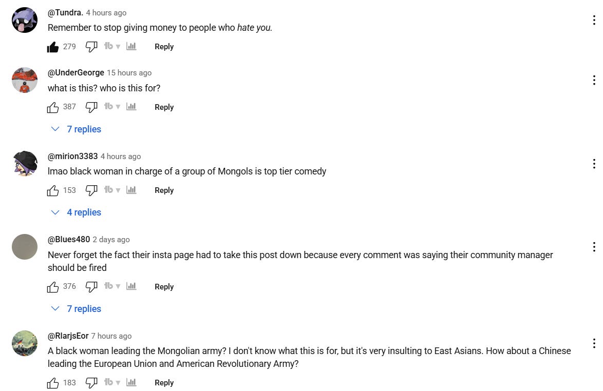 “A black woman leading the Mongolian army? I don't know what this is for, but it's very insulting to East Asians,” wrote one. “How about a Chinese leading the European Union and American Revolutionary Army?”
