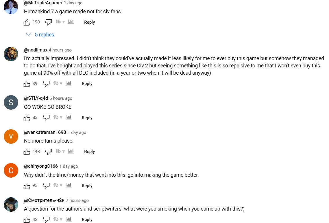 “I'm actually impressed,” said one. “I didn't think they could've actually made it less likely for me to ever buy this game but somehow they managed to do that. I've bought and played this series since Civ 2 but seeing something like this is so repulsive to me that I won't even buy this game at 90% off with all DLC included (in a year or two when it will be dead anyway)”
