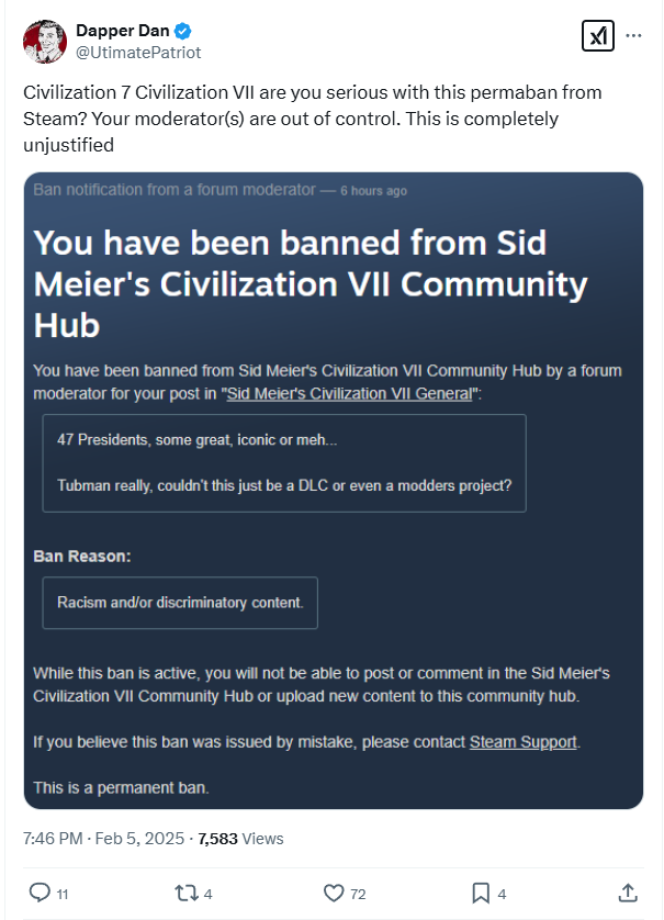 X user UltimatePatriot shared on X that he was banned from the Civilization VII Steam forum for posting, “47 presidents, some great, iconic or meh… Tubman really, couldn’t this just be a DLC or even a modders project?”