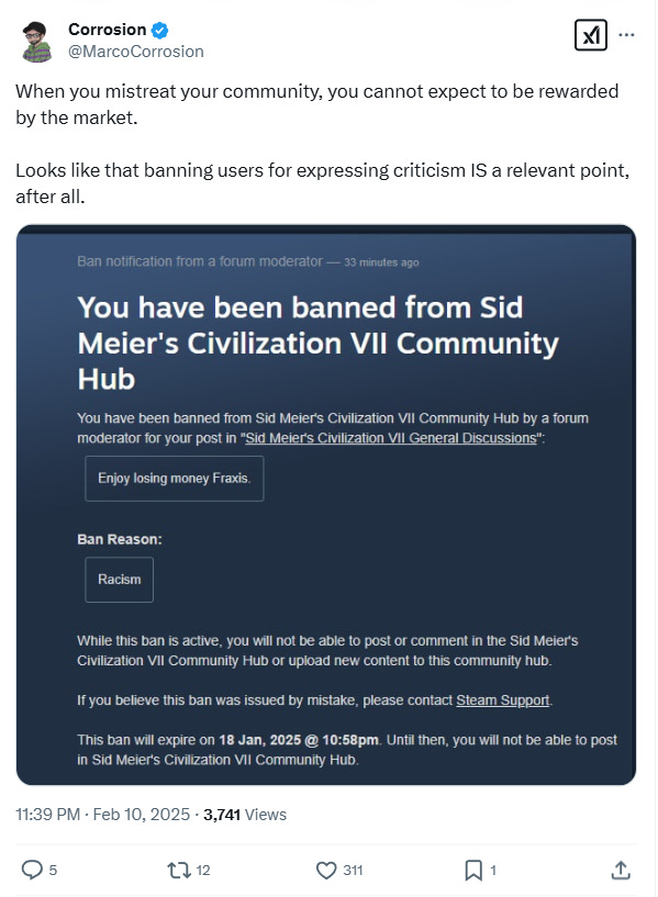 He reacted to this ban writing on X, “Civilization 7 Civilization VII are you serious with this permaban from Steam? Your moderator(s) are out of control. This is completely unjustified.”