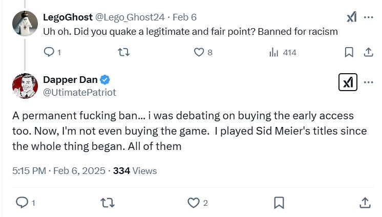He wrote, “A permanent f***ing ban... i was debating on buying the early access too. Now, I'm not even buying the game. I played Sid Meier's titles since the whole thing began. All of them.”
