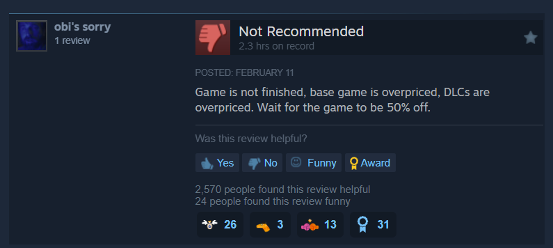 Obi’s sorry wrote, “Game is not finished, base game is overpriced, DLCs are overpriced. Wait for the game to be 50% off.”