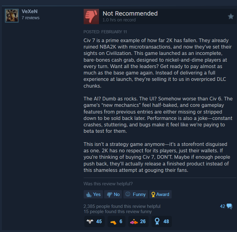 VeXen posted, “Civ 7 is a prime example of how far 2K has fallen. They already ruined NBA2K with microtransactions, and now they’ve set their sights on Civilization. This game launched as an incomplete, bare-bones cash grab, designed to nickel-and-dime players at every turn. Want all the leaders? Get ready to pay almost as much as the base game again. Instead of delivering a full experience at launch, they’re selling it to us in overpriced DLC chunks.”