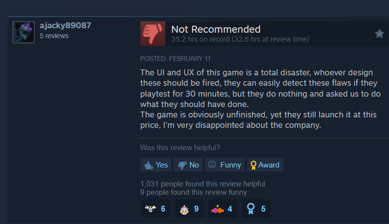 Ajacky89087 wrote, “The UI and UX of this game is a total disaster, whoever design these should be fired, they can easily detect these flaws if they playtest for 30 minutes, but they do nothing and asked us to do what they should have done.