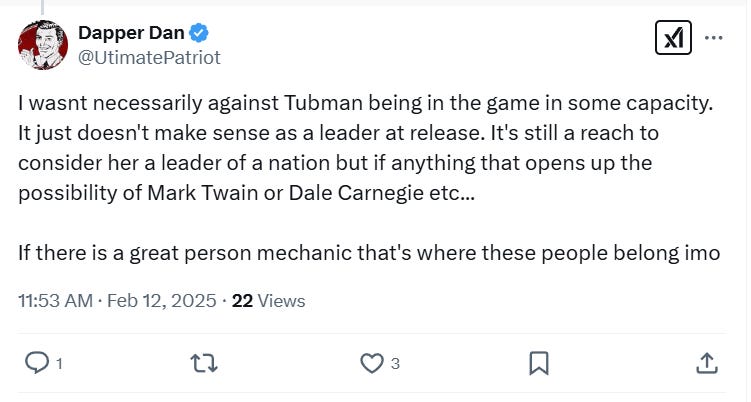 He also shared, “I wasn’t necessarily against Tubman being in the game in some capacity. It just doesn't make sense as a leader at release. It's still a reach to consider her a leader of a nation but if anything that opens up the possibility of Mark Twain or Dale Carnegie etc... If there is a great person mechanic that's where these people belong imo.”