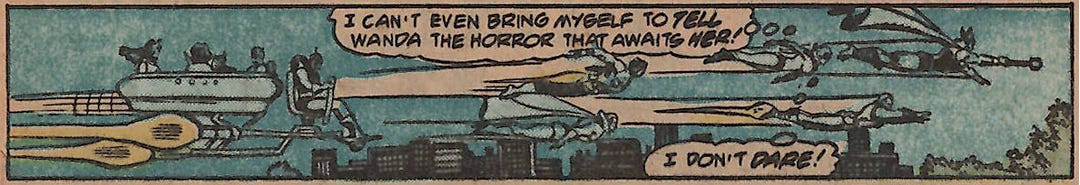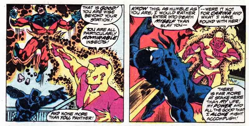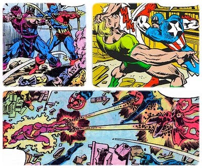 As Marvel bullpen writers tended to do in their heyday, the dialog ranges from arch to grandiose. I think this was a Stan Lee tradition that lived on long after his departure to the Left Coast. The colorists often got lazy. When characters are in the background or even just small in the frame, no detailed coloring was attempted--the line art was simply filled in monochrome--all the characters the same color and shade respective to the panel.